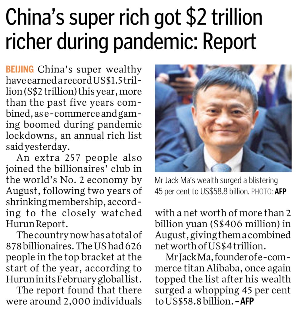 When people are losing jobs and businesses are closing, Singapore gained 3 billionaires and China’s super rich got $2 trillion richer.