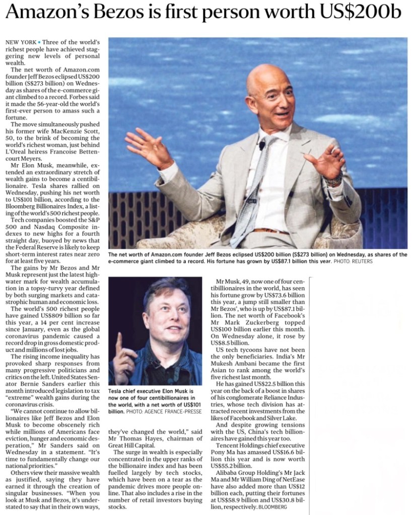 Jeff Bezos of Amazon because the first person in history whose financial nett worth crossed US$200B. And it happened in Q3 of 2020 in the midst of the COVID-19 pandemic where tech stocks saw a boom due to increased e-commerce and online activities.
