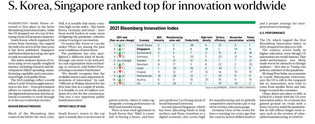 The Bloomberg Innovation index ranked South Korea and Singapore top win worldwide rankings. The US was ranked 11th as each country was measured against a suite of initiatives. This ranking was published in Jan 2021.